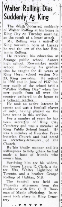 Walter died of a heart attack on June 10, 1943. He was survived by his wife, Laura, his sister, Mrs. Florence Lightfoot, and his brother, George Rolling. The funeral took place at Walter's home, with many people in attendance, a sign of the high regard in which he was held. Walter was buried at the King City Cemetery with his parents.