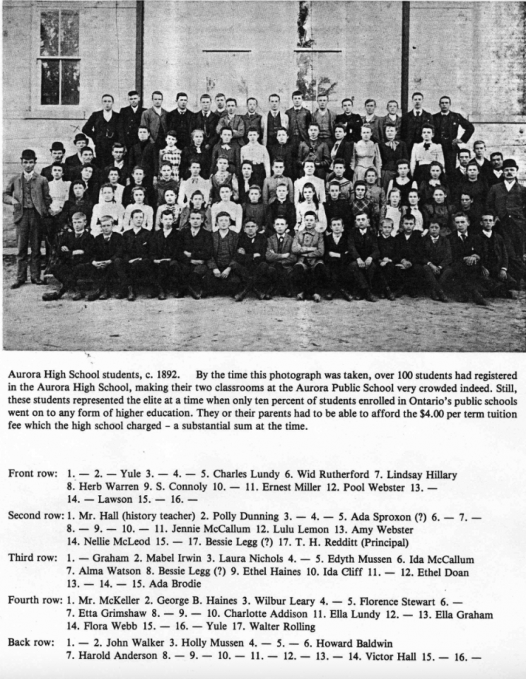 Walter Rolling's class at Aurora High School, 1892 After graduating from high school, Walter earned his Third Class Teaching Certificate from the Newmarket Model School. His first teaching job was at a school in Aurora; he was then hired to teach at S.S. #23 Kinghorn School (the current home of the King Heritage & Cultural Centre). Walter's first year salary at the one-room schoolhouse was $295, $15 less than Miss Alice Ferguson who he replaced. By his second year, his pay was increased to $310 per year. To help compensate his salary, Walter held other part-time jobs, such as selling tombstones for a company in Orangeville!