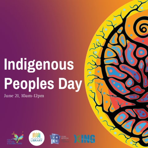 In partnership with the King Township Public Library (KTPL) and York Region Arts Council (YRAC), the King Heritage & Cultural Centre (KHCC) is proud to present an event in honour of National Indigenous Peoples Day on June 21 from 10:00am to 12:00pm. Join us as we celebrate the heritage, diverse cultures and outstanding achievements of Indigenous people through artistic expression and community participation.