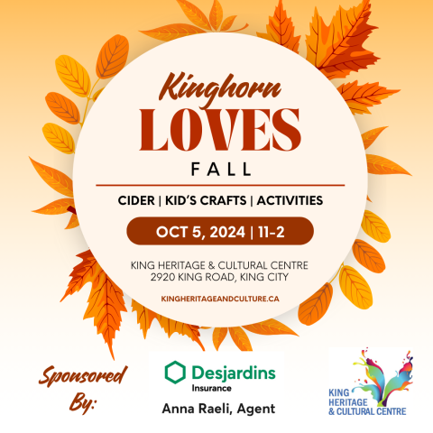Join Anna Raeli, Desjardin Insurance and the King Heritage and Cultural Centre for Kinghorn Loves Fall! on October 5, 2024 from 11AM to 2PM at the King Heritage and Cultural Centre at 2920 King Road, King City. There'll be fun for the whole family with kid's crafts, activities, and cider!